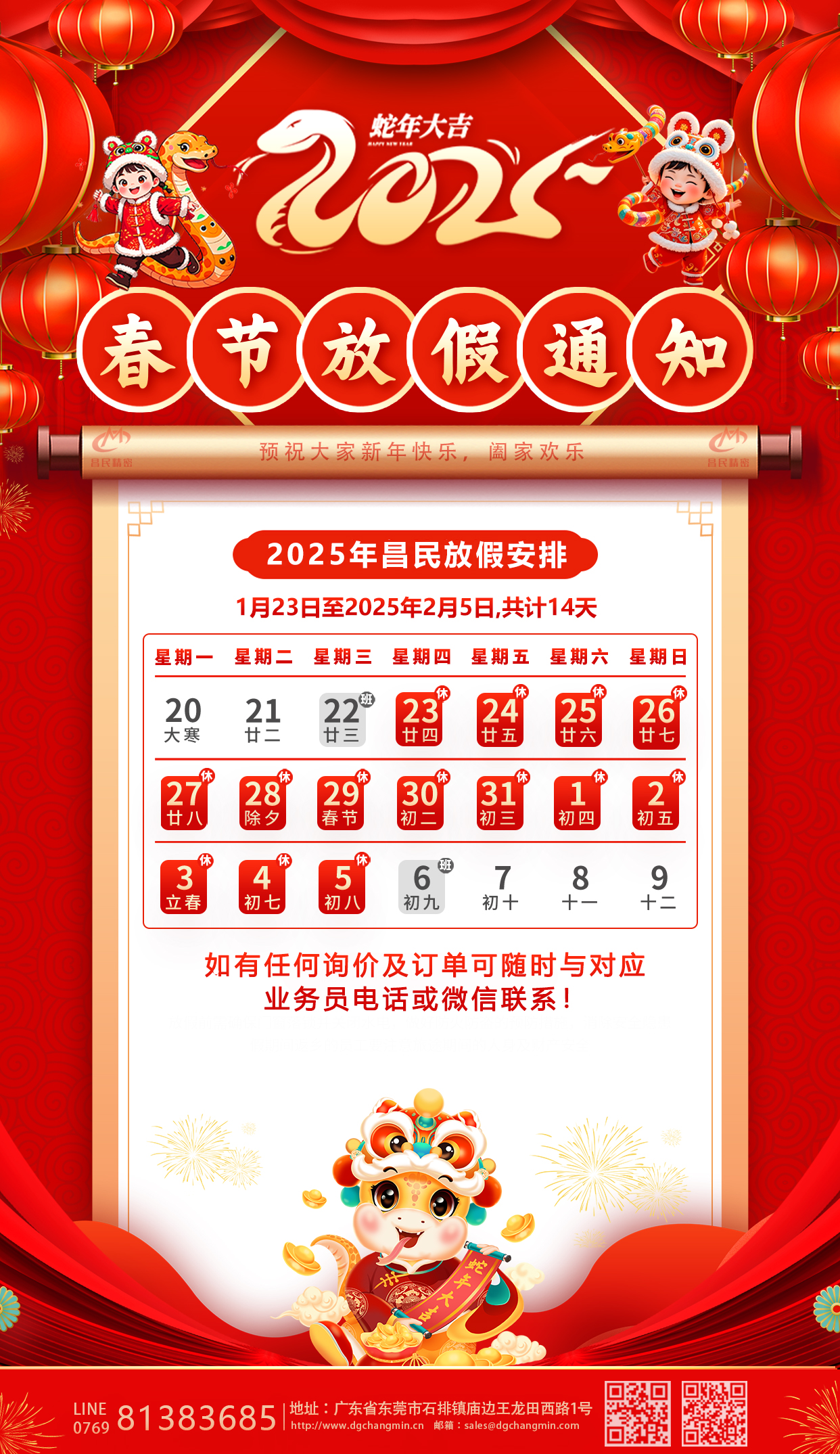 值此新春佳节来临之际,为让大家拥有一个快乐而充实的春节,根据国家相关规定并结合我司实际情况放假通知安排如下:123日至202525日,共计14天,202526日开工正式上班期间,大家可以尽情享受与家人团聚的美好时光,感受浓浓的年味! 在此,昌民全体同仁预祝大家新春快乐,阖家幸福,万事如意!最后,再次衷心感谢新老客户在过去一年里的支持与帮助,让我们共同期待2025,大家一起携手前行,共创辉煌!